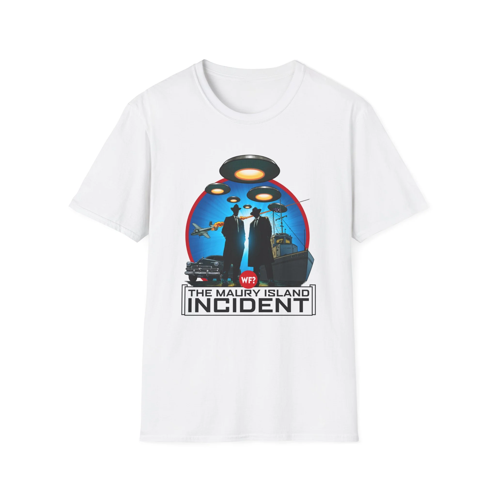 Dodge debris and hot slag like a pro in a Maury Island Incident T-Shirt from The Why Files! This ultra-soft cotton top showcases all the elements that make this mystery come to life, from the silhouetted Men in Black to the unit of flying saucers.